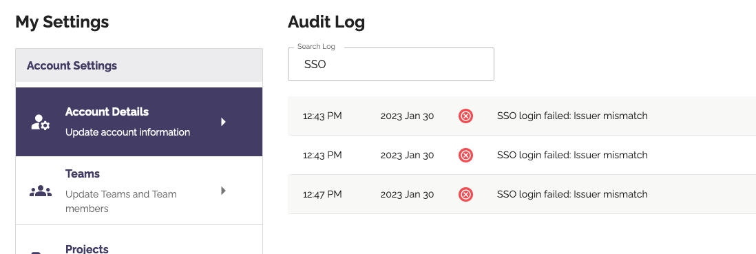 Trouble shooting Single Sign-On can be difficult as logs are often limited. Hava makes logs available as part of the Account Audit Logs. These can be used to validate and debug configuration issues with the setup.
