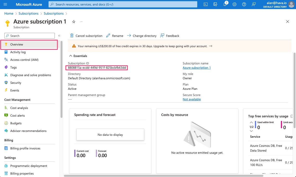 You will need four separate parameters to give Hava access to your account, first off is the subscription ID.