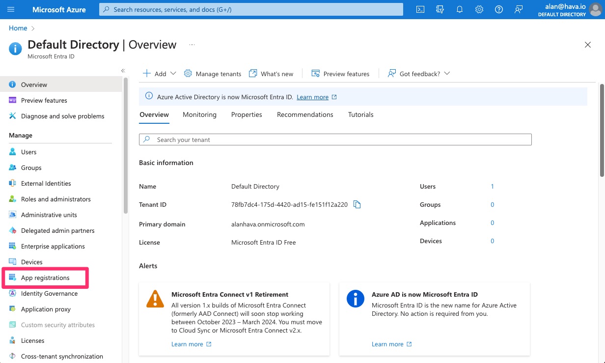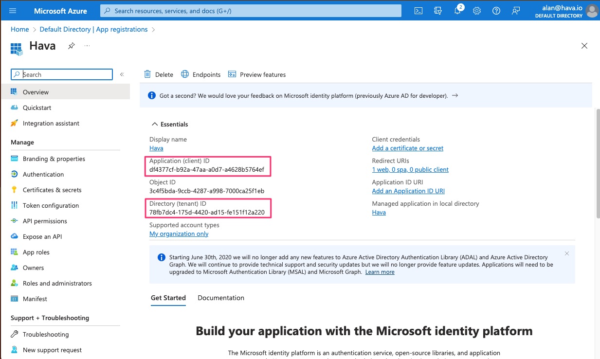 Here you will find the Application ID and Tenant ID to copy and paste into Hava.