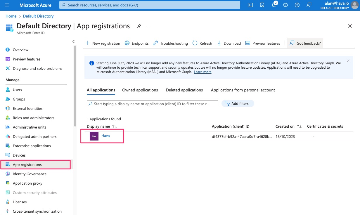 Havafrom the app registration list.