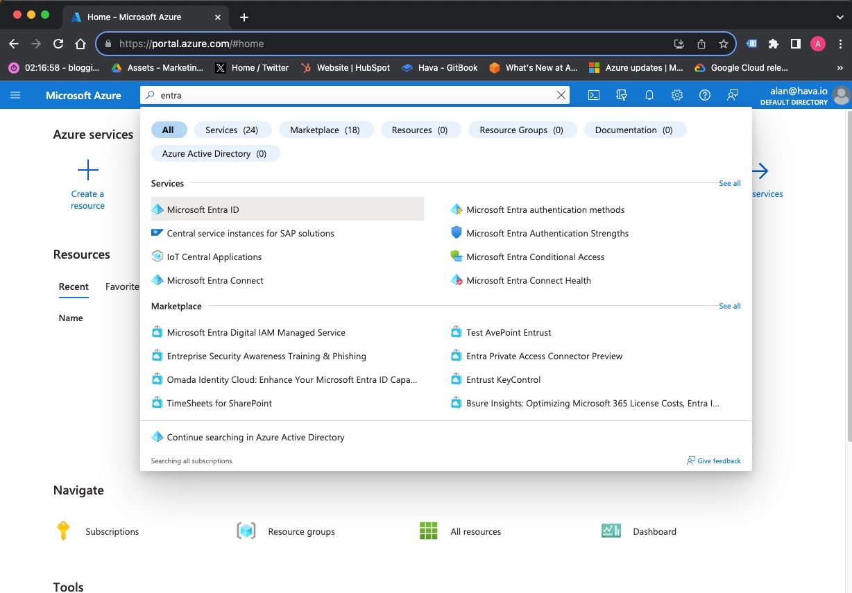 To allow Hava to import your Azure account you will need to provide access by creating an Active Directory (Microsoft Entra ID) application and assigning read-only permissions to it. To create Entra ID applications you will need admin access to the Azure account.